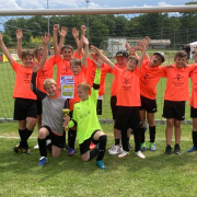 Nach zweijähriger Pause konnte am 24.06.22 endlich wieder ein Fußballturnier für die Grundschulen statt. Dabei konnten 12 Jungs der vierten Klassen teilnehmen und wurden vorher ausgewählt. So starteten Luca, Felix L., Valentin, Matteo, Colin, Felix K., Sebastian, Liam, Elias, Julian, Ben und Lennart am Morgen fröhlich in Richtung Neudorf. Wir bezogen unser Quartier unter unserem Pavillon, den wir mit den Plakaten unserer Mitschüler aufhübschten.
