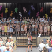 Der Festtag begann in der Lußhardthalle mit einem feierlichen Eröffnungskonzert aller Schulkinder unter Leitung von Frau Herkert. Begleitet wurde der Chor von Frau Zimmermann am Klavier. Frau Brenner leitete das Schüler-Orchester, welches zwei Lieder musikalisch umrahmte. Rektor Herr Bensching begrüßte in seiner Rede zahlreiche Ehrengäste sowie das gesamte Publikum in der voll besetzten Lußhardthalle und freute sich, dass so viele der Einladung der Schule gefolgt waren. Er betonte, dass hier viele Kinderscharen ein- und ausgingen, sich am Lernort Schule sehr wohlgefühlt und viel für´s Leben gelernt haben. Das abwechslungsreiche Programm reichte von „Wir feiern heute ein Schulfest“ über „Unsere Schule hat keine Segel“ , „What shall we do with a drunken sailor“ bis hin zu „Applaus, Applaus“ von den Sportfreunden Stiller. Bürgermeister Dr. Marc Wagner blickte auf seine eigene Grundschulzeit zurück, lobte in seiner Ansprache die hervorragende Arbeit, die vom Lehrerkollegium geleistet wird und die gute Zusammenarbeit mit der Schulleitung. Herr Angerhofer vom Staatlichen Schulamt Karlsruhe zeigte sich erfreut über das gelungene Konzert und den Stellenwert, den die Musik an der Grundschule genießt und das entspannte und familiäre Klima der Schulgemeinschaft. Herr Pfarrer Bretl sprach noch einen Segen, bevor der letzte Song „We are the World“ erklang. Am Ende gab es tosenden Applaus für die musikalischen Vorträge der Kinder und Standing Ovations von den begeisterten Gästen. Zum Schluss bedankte sich Herr Bensching noch bei den Kindern für ihre hervorragende Leistung beim Auftritt sowie beim Elternbeirat und den vielen Helfern, die zum Gelingen des Festtags beigetragen haben.