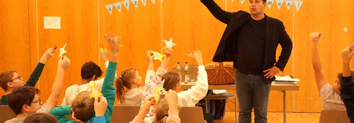 Soziologe, Schriftsteller und Kinderbuchautor Armin Pongs bei einer Vorlesung an der Pfarrer Graf-Schule zu Gast. Grundschüler vom „Lesemillionär“, „Krokofil“ und dem „Magischen Kalender“ verzaubert