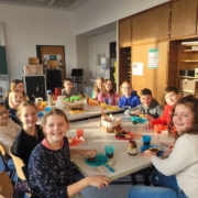 Zwölf Schülerinnen und Schüler der 4. Klassen haben sich auf das Angebot der Schulseelsorge eingelassen, einen Schulalltag einmal ganz anders zu beginnen – mit Liedern, Gebet, Besinnung und anschließendem gemeinsamen Frühstück. Sie sind daher deutlich früher aufgestanden und haben sich schon um 7.10 in der Schule getroffen. Passend zur Fastenzeit vor Ostern, haben sie einen Blick gewagt auf die Sorgen und Probleme die auch ihren Weg belasten und konnten diesen mit einem Stein und einer Fürbitte bei dem Kreuz plazieren. Der hoffnungsvollen Zusage gewiss, dasss wir alle unsere Sorgen auf Gott werfen dürfen, wurden beim anschließenden Psalmgebet Lichter oder Blumen zum Kreuz gestellt. Das gemeinsame Frühstück mit Tee, Kaba und Brötchen rundete die Frühschicht ab und alle gingen gestärkt und gut gelaunt zum Unterricht.