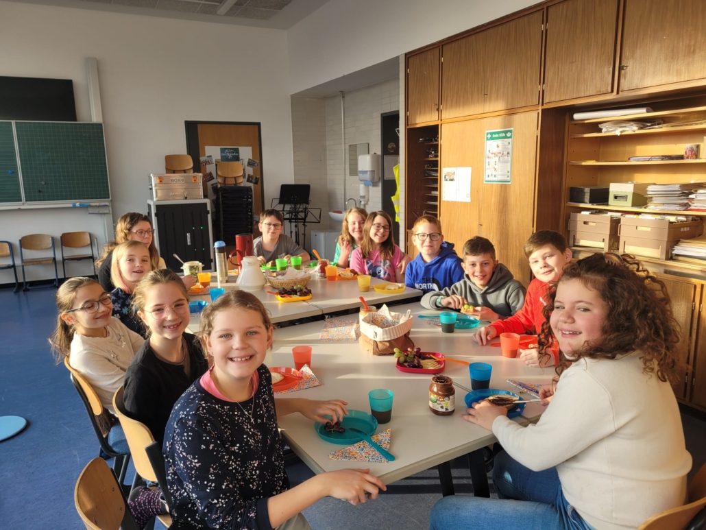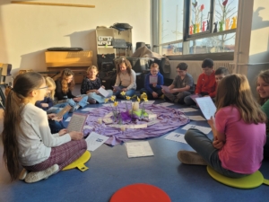 Zwölf Schülerinnen und Schüler der 4. Klassen haben sich auf das Angebot der Schulseelsorge eingelassen, einen Schulalltag einmal ganz anders zu beginnen – mit Liedern, Gebet, Besinnung und anschließendem gemeinsamen Frühstück. Sie sind daher deutlich früher aufgestanden und haben sich schon um 7.10 in der Schule getroffen. Passend zur Fastenzeit vor Ostern, haben sie einen Blick gewagt auf die Sorgen und Probleme die auch ihren Weg belasten und konnten diesen mit einem Stein und einer Fürbitte bei dem Kreuz plazieren. Der hoffnungsvollen Zusage gewiss, dasss wir alle unsere Sorgen auf Gott werfen dürfen, wurden beim anschließenden Psalmgebet Lichter oder Blumen zum Kreuz gestellt. Das gemeinsame Frühstück mit Tee, Kaba und Brötchen rundete die Frühschicht ab und alle gingen gestärkt und gut gelaunt zum Unterricht.